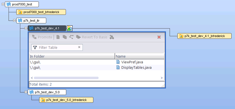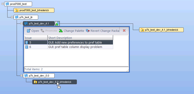 The team working on Release 5.0 wants to incorporate the changes done by the 4.1 team into their own code. If 4.1 was already completed and released, the 4.1 changes would have already been promoted up to the integration stream (the common parent for the development streams), and the changes would be automatically inherited by the 5.0 stream. However, things do not always work in such an orderly manner in the software development world, so the 5.0 team decides to cross-promote Issue #5 from the 4.1 development stream to one of the workspaces under the 5.0 stream. When you cross-promote an issue, you cross-promote the elements of the change package associated with that issue. So this operation brings the 4.1 versions of ViewPref.java and DisplayTables.java associated with Issue 5 into the 5.0 stream structure. Perform the cross-promote with a simple drag & drop of Issue #5 from the 4.1 stream Active Issues view to the 5.0 workspace: