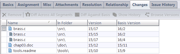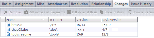 The change package for this new issue now includes multiple entries for one of the files, due to the introduction of multi-segments — the ability of AccuRev change packages to track and correctly handle versions that are not necessarily related to the current changes.