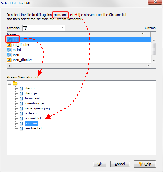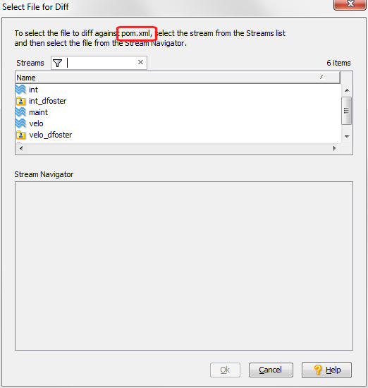 In the Streams field, select the stream or workspace associated with the file you want to diff against the file you selected in Step 1.