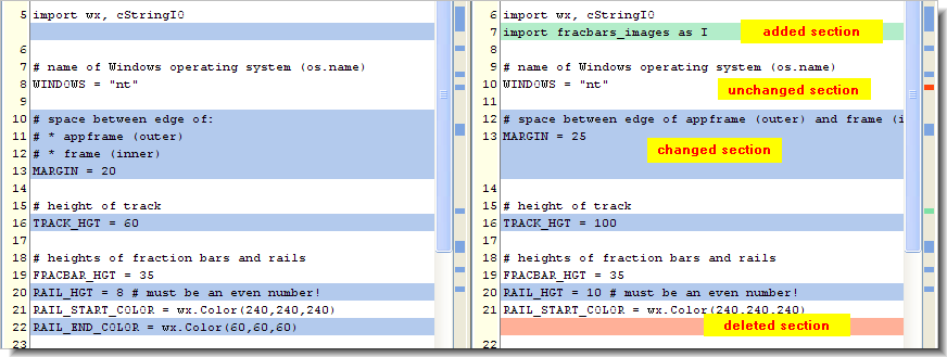 Through color-coding, the Diff tool partitions the text into the following kinds of "difference sections":