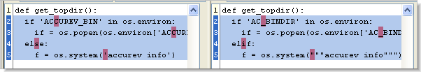 Changed Section (blue background): Sometimes, the Diff tool decides that a text section in the "before" version has been revised, producing the corresponding section in the "after" version. The before and after sections are not necessarily the same length, in which case some empty space is displayed in one of the versions. Both the before and after sections appear with a blue background. Both sections contain red character highlights, indicating the first location in a line where the two versions differ: