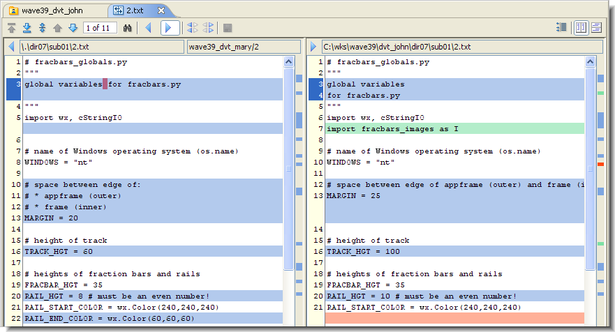 The Diff tool displays the two versions side-by-side in separate panes, so that corresponding text lines in the versions line up visually.