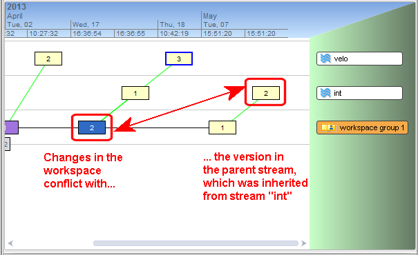 Generally speaking, the typical conflict that occurs in a workspace or a stream is an overlap — the current version in the parent stream is not an ancestor of the version in the current workspace or stream. This can happen, for example, when users in separate workspaces are working on the same file and one of them promotes his or her changes to the workspaces’ parent stream.