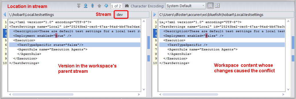 In this example, note that the Diff pane depicts the conflict between the workspace content and its parent, the dev stream, but that the Version Browser shows the stream where the change originated, int. This is because the int stream is the stream from which the workspace version’s parent stream (dev) inherited the change.