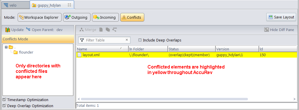 The Conflicts mode displays files in your workspace whose changes conflict with another version of that file elsewhere in the stream hierarchy — often, but not always, the version in the parent stream. Overlaps, deep overlaps, and twins are all examples of the types of conflicts displayed in this mode. Note that while other File Browser modes also display conflicts, only the Conflicts mode can show elements with deep overlap conflicts.