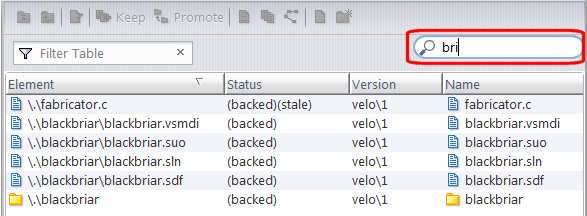 The Search Workspace field in the Workspace Explorer mode lets you search the current workspace for any files and directories whose name matches the string you enter. You can enter any character that is legal for an AccuRev element name. (See User-Specified Names for AccuRev Entities for details.) Wildcards ("*" and "?") are accepted. If you do not use wildcards, AccuRev searches the workspace for any object whose name contains the string you enter. Entering "bri" returns both fabricator.c and all blackbriar files and directories, for example:
