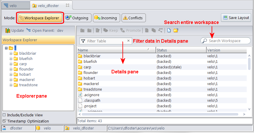 Generally speaking, the Explorer mode displays all the contents of the current stream or workspace. When you select a directory in the Explorer pane, the Details pane shows only the files and subdirectories for that directory.