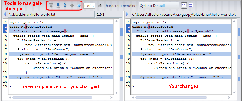 If user hdylan makes changes to the file for a Spanish speaking user and then keeps his changes, the Diff pane in Outgoing Mode shows the original version of the file before his changes (i.e., the basis version) on the left, and the changes he made to that version on the right, as shown here: