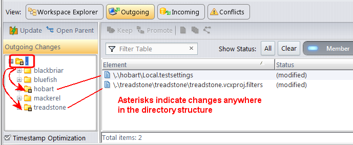 Note that directories are marked with an asterisk regardless of where in the directory the change is located. Here, for example, the \treadstone directory has an asterisk even though the modified file is located in the \treadstone\treadstone subdirectory, and not at the directory root (as is the case with the change in the \hobart directory). Similarly, the root node is marked with an asterisk if there are changes anywhere in the workspace or stream.