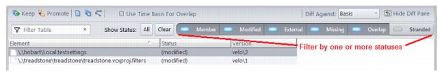 The Details pane toolbar includes a filter that lets you filter by one or more of AccuRev statuses.