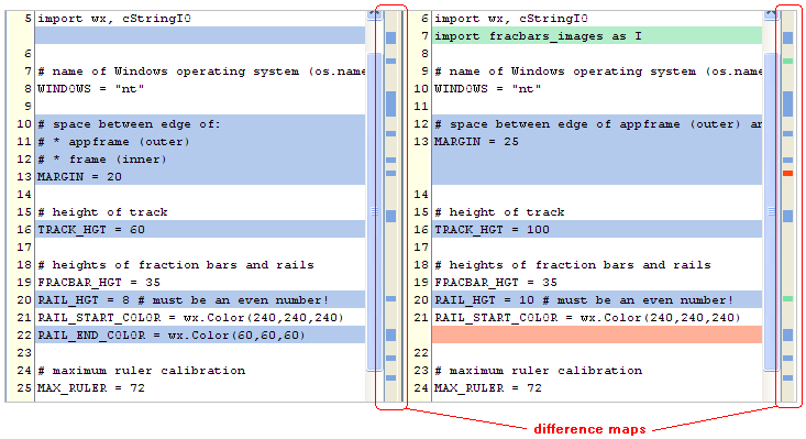 To the right of each pane, there's a difference map that shows the relative locations and sizes of all the difference sections. The maps use the same color-coding (see Color-Coding of the Contributor Versions) as the difference sections themselves. Click on any colored area within a map to scroll both panes directly to the corresponding difference section. (Actually, you can click anywhere in the difference map; the panes will scroll to that location, even if the files are identical there.)