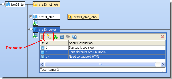 - Invoking Promote from the subwindow’s toolbar or the context menu of the issue(s).