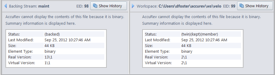 • Binary files. If the file type of the element with (twin) status is binary, the twin resolution wizard displays a table that summarizes information about each version (the date the file was last modified, real and virtual version numbers, and so on).