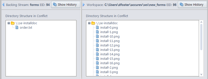 • Directories. When you resolve a directory with a (twin) status, the twin resolution wizard displays navigable trees for the directories that are in conflict, allowing you to easily compare directory contents.