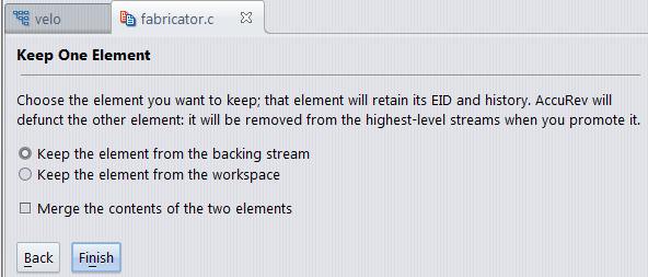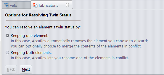 • Keep one element. Choose this option if you know which element you want to keep; AccuRev will automatically defunct the other. Then, click Next and go to Step 4.