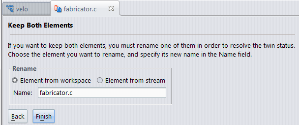 • Rename one of the elements in conflict. This action lets you keep both versions in AccuRev.