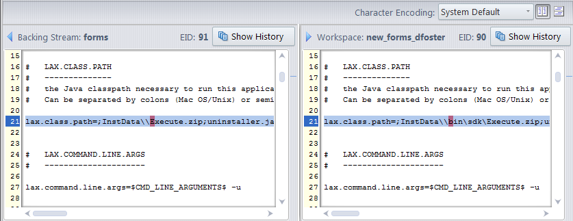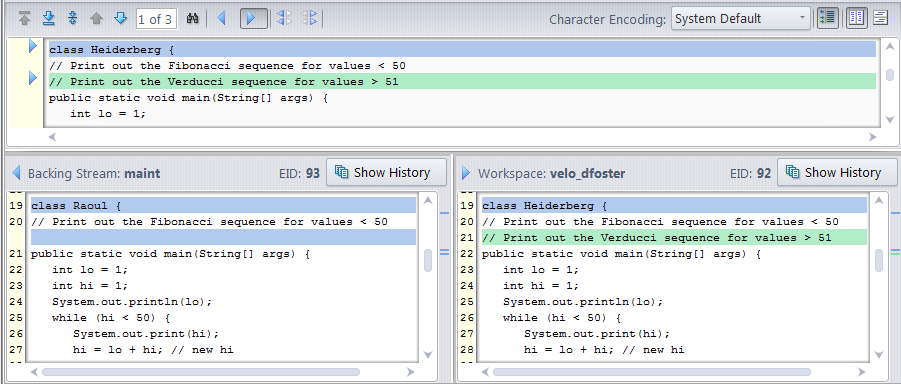 • You want to compare the elements that are in conflict. Before deciding whether to defunct or rename an element that is in conflict, it can be useful to compare the versions side-by-side. The twin resolution wizard provides a Diff view for directories and files. The information that is displayed varies by type — colors are used to show changed, added, and deleted text in text files, for example. See Diff View Varies Based on Element Type below for more information. AccuRev also displays the element ID (EID) of the versions in conflict.