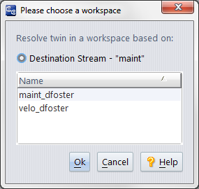 Note for Change Palette users: If you are defuncting the twin element from the Change Palette, AccuRev displays the Please Choose a Workspace dialog box. The Please Choose a Workspace dialog box displays a list of workspaces off the destination stream you selected when creating the Change Palette. AccuRev needs this workspace in order to resolve the twin elements. For example: