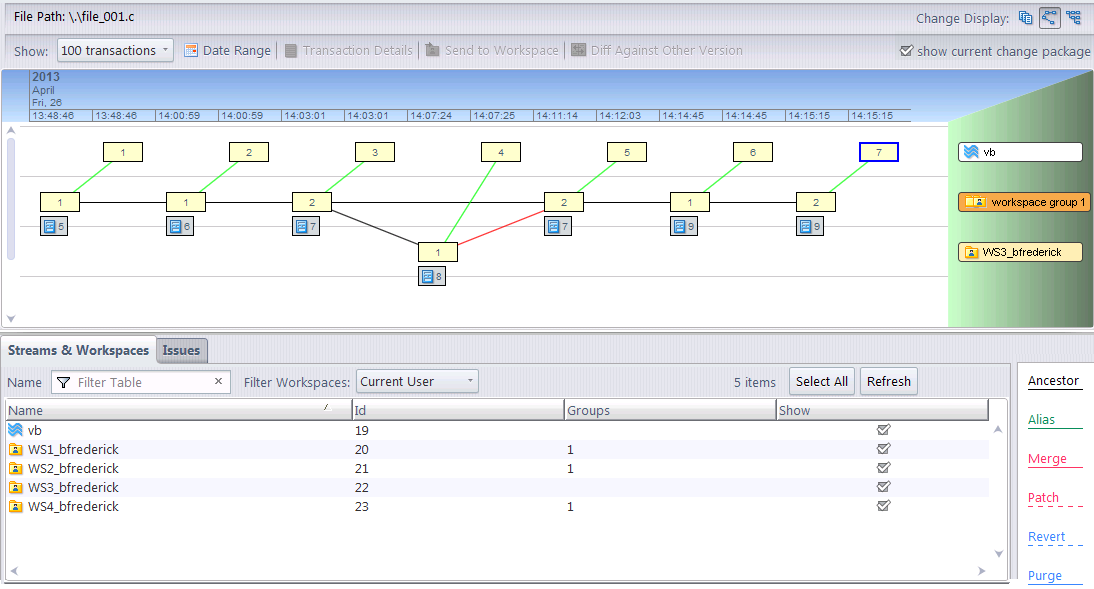 In earlier versions of the AccuRev Version Browser, each workspace would have generated a new row in the graphical view, along with ancestry lines connecting the versions. In large installations with many workspaces and many changes, the Version Browser display could quickly become unmanageable.