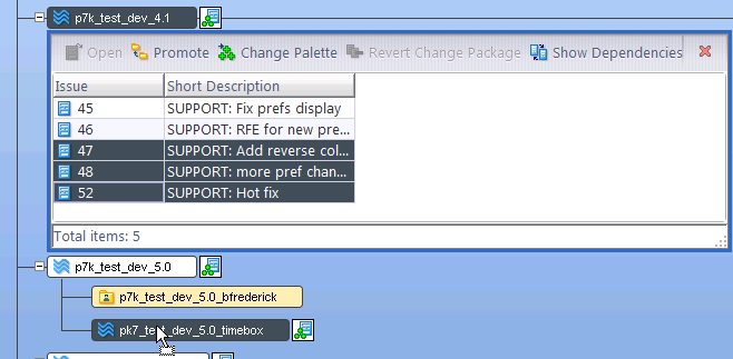 Open an Active Issues window for the stream to which the versions were promoted, then select issues #41 and #43 and invoke Send to Change Palette. Since there is a "change package gap", consisting of versions 4 and 5, between the two change package entries for
