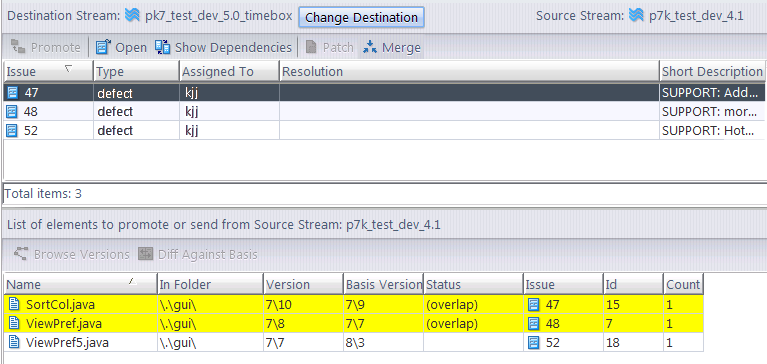 In the following example, three issues are drag & dropped from stream p7k_test_dev_4.1 to stream pk7_test_dev5.0_timebox: