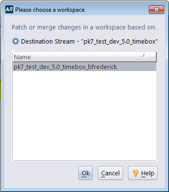 button in the pane's toolbar or choose Patch from the selection's context menu. AccuRev prompts you to select a workspace that belongs to you and is based on the destination stream. The patch operation is performed in this workspace, as described in Patch and Patch From.