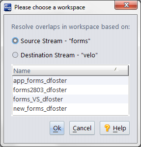 The Please Choose a Workspace dialog box is also used when patching changes and resolving an element’s twin status. See Patch changes from the source version into the destination version and Resolving Twins from the Change Palette for more information.