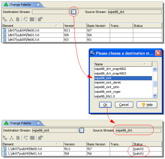 If you've loaded versions into the Change Palette using Send to Change Palette, you've already indicated the source stream, but need to specify the destination stream or workspace. (The drag-and-drop operation indicates both the source and destination.)