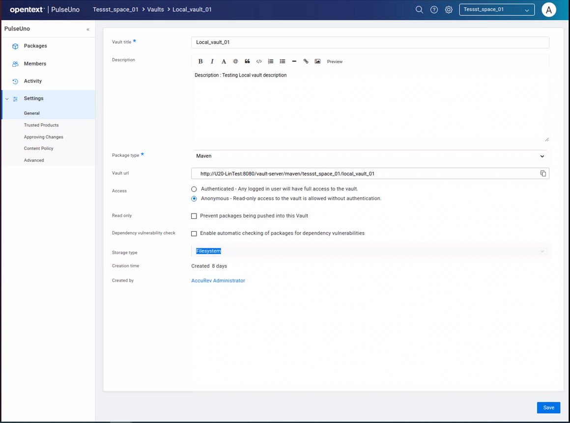 Update the settings of your vault, as needed. You cannot change the package type and storage type.