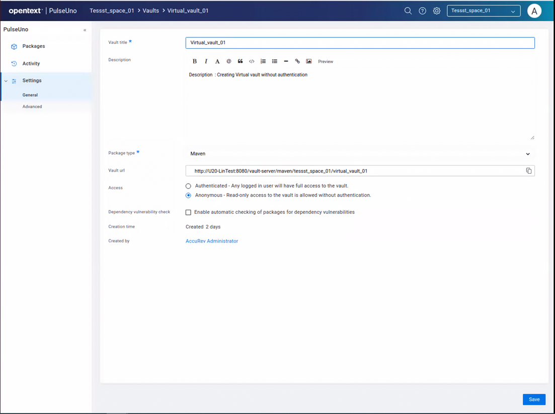 Field Description Vault title Enter a name for the virtual vault. Description (Optional) Enter a description for the virtual vault. Package type Select a vault package type: Maven, npm, Docker, PyPI, or NuGet. Access Select the access permission: