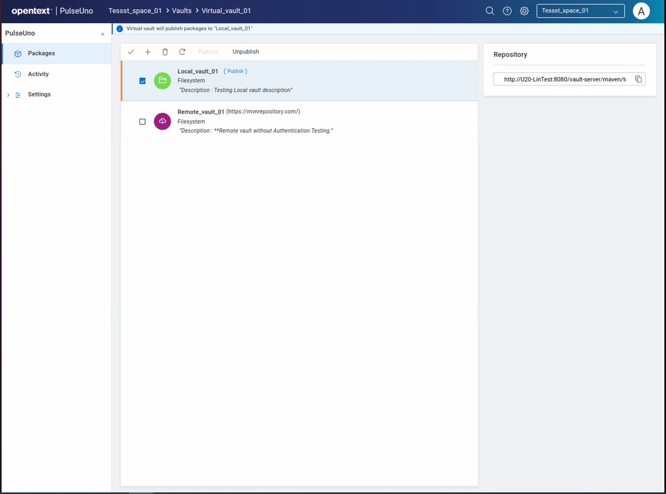 Drill down to view information about each vault, such as packages, URL, and statistics.