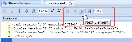 In this example, the file currently displayed in the Diff tab is locales.xml. One other file was selected for diffing at the same time, as indicated by the value 1 of 2. In this example, you would use either the Next Element or Last Element to display the second diffed file.