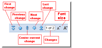 Navigation buttons let you quickly jump to the first, last, next, and previous changes in the file being diffed; you can also center the current change in the display, which can make it easier to understand the context for the change. The numeric field to the right of the navigation buttons shows: