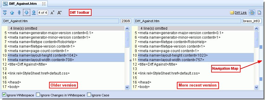 The Diff tab shows the files being compared side by side in realizable panes. The older version is displayed in the left pane, the more recent version is displayed in the right pane. The differences between the files are color-coded, as shown in the following table: