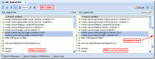The navigation map, to the right of the vertical scroll bar, shows the relative locations and sizes of the areas that differ between the two files. It uses the same color-coding as the difference sections. Click on any point within the navigation map to scroll directly to that area in the file.