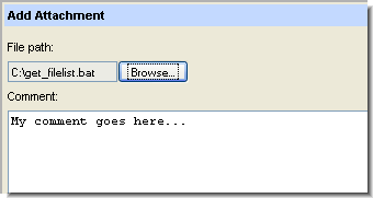 Defines a new file attachment for this issue record. An Add Attachment dialog box appears, in which you can specify a file to attach and, optionally, a comment string.