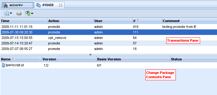 The Change Package History tab displays the transactions that are part of the current issue's change package. Transactions are displayed in the transactions pane. The change package —all the items associated with a specific transaction—are displayed in the change package contents pane when you select a transaction in the transaction pane. The change package contents pane displays the file name, version, basis version, and status for each element in the change package.