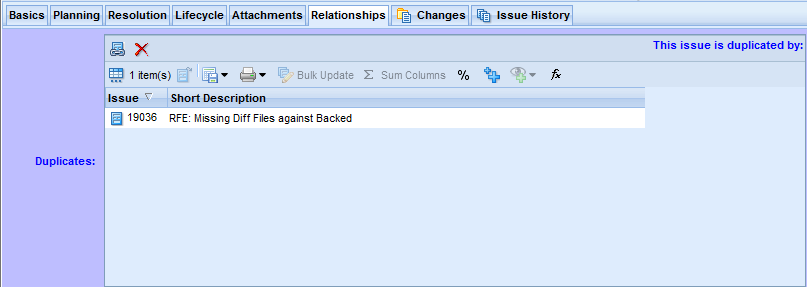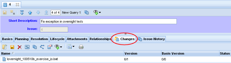 - The Changes Subtab displays the issue record's change package, and provides commands for analyzing and manipulating the change package's entries. To see the change package in a separate tab, click the