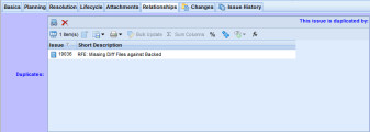 AccuRev supports four types of relationships that can be used to link issues: dependencies, duplicates, subtasks, and tracking issues. Each relationship type has its own section on the Relationships subtab, like the Duplicates section shown here: