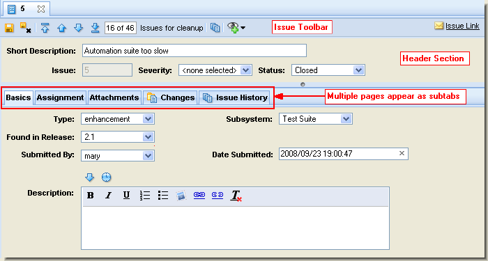 - The Issue Edit form consists of one or more pages, which appear as subtabs within the overall issue tab. Examples of subtabs in the preceding illustration include Basics, Assignment, and Changes.