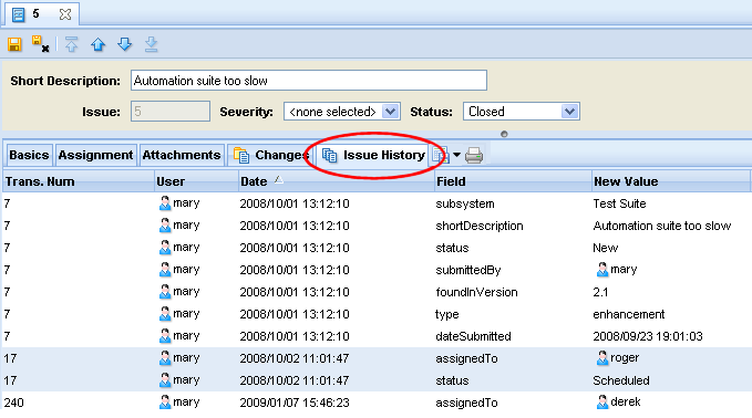 The Issue History subtab of the Issue Edit form shows, on a field-by-field basis, how the issue record has changed over time. Each row corresponds to a field in the issue record.