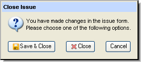 If you attempt to close the Issue Edit form without saving, the AccuRev prompts you to save your changes. If you do not want to save your work, click Close.