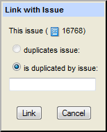 Adds a link to an existing issue. AccuRev displays a dialog box that lets you choose the relationship type and enter the issue number of the issue you are linking to the current issue.