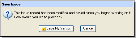 If the issue you are working on has been edited and saved by another user during the time you are making changes, AccuRev notifies you when you attempt to save.