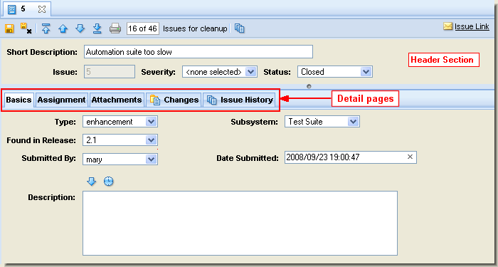The issue details report provides detailed information about one or more individual issues. The information in the report is based on the information that appears on the Issue Edit form, including the header section and most of the Issue Edit form’s subtabs—Basics, Assignment, and so on: