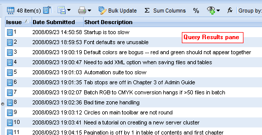 The issue table report provides summary information about all issues displayed in a table, like the table in the Query Results pane shown here, for example: