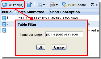 After you set the number of items per page, the issues are shown in pages rather than one long list. The default number of items is 500. When there are more items than the limit, page navigation links appear above the table header as shown here.