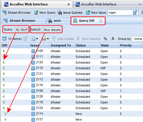 Diffs the results of two queries; results of the diff operation are displayed in the Query Diff tab. The names of the queries you are diffing are displayed at the top of the tab. Arrows in the Diff column indicate whether an issue was returned by the first query (