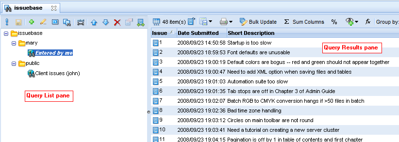 Another way to simplify the display of the Query Result pane is to sort issues based on a particular column. For example, you might want to sort issues numerically, in either ascending or descending order. To sort issues, just click on the column heading.