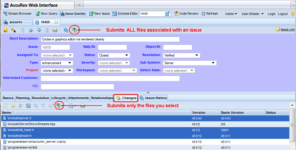 ) highlighted in this particular view -- one on the Issue Edit form toolbar, another on the Changes subtab toolbar. AccuRev responds differently depending on which button you click:
